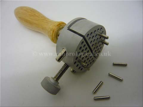 Universal works holder with repositionable pins to hold any shape securely while working on it. Top unscrews to attach to bench vice or can be used with wooden handle
